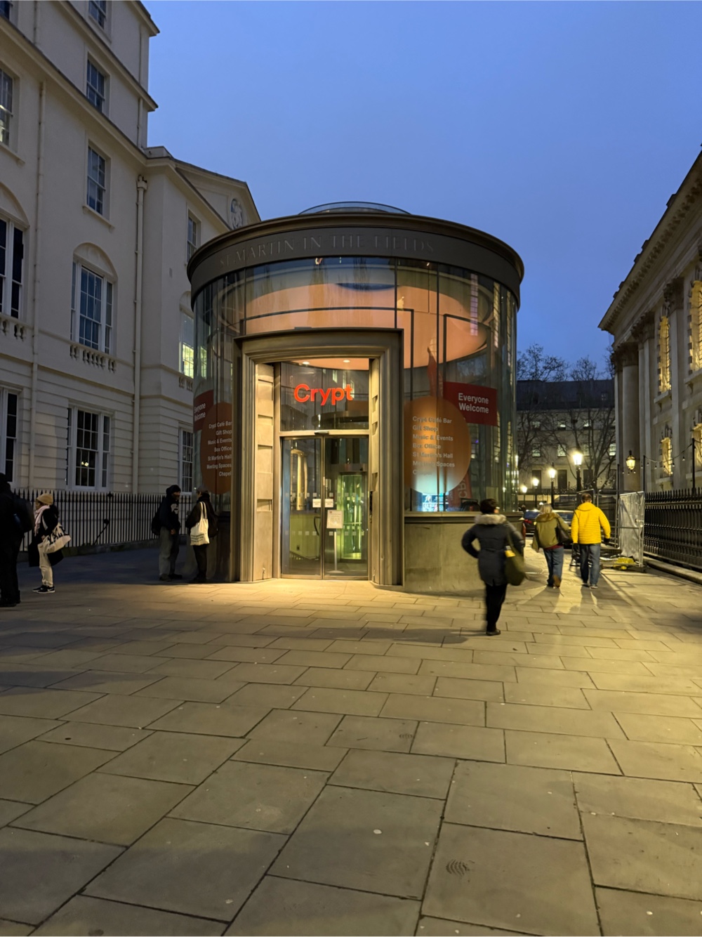 We have tickets tonight to see a concert called “Soul Sisters” in the Crypt at St. Martin of the Fields. Every time I have been to London I have wanted to hear a concert in the crypt. I was so glad it worked out this time. We entered through this glass structure.