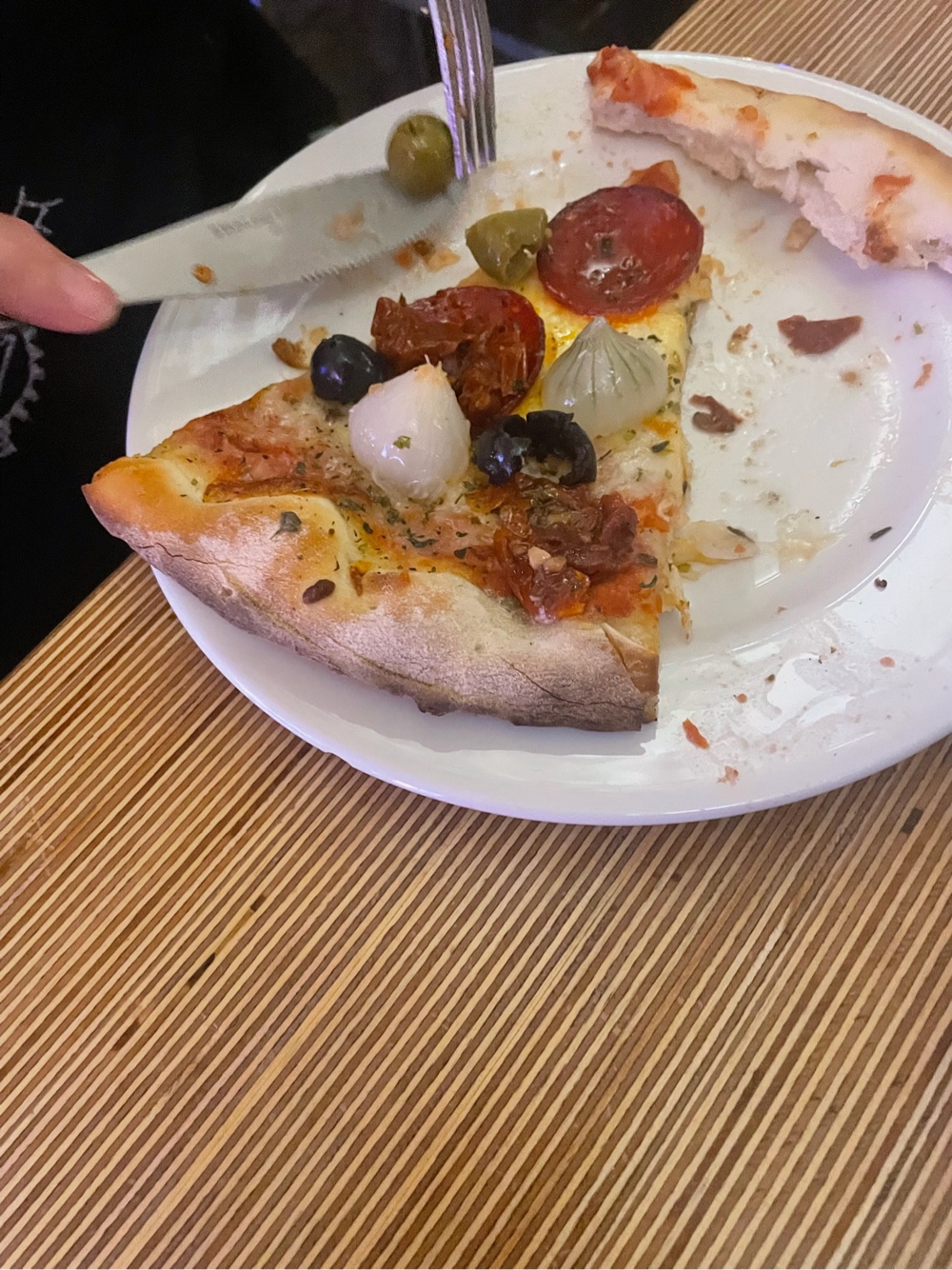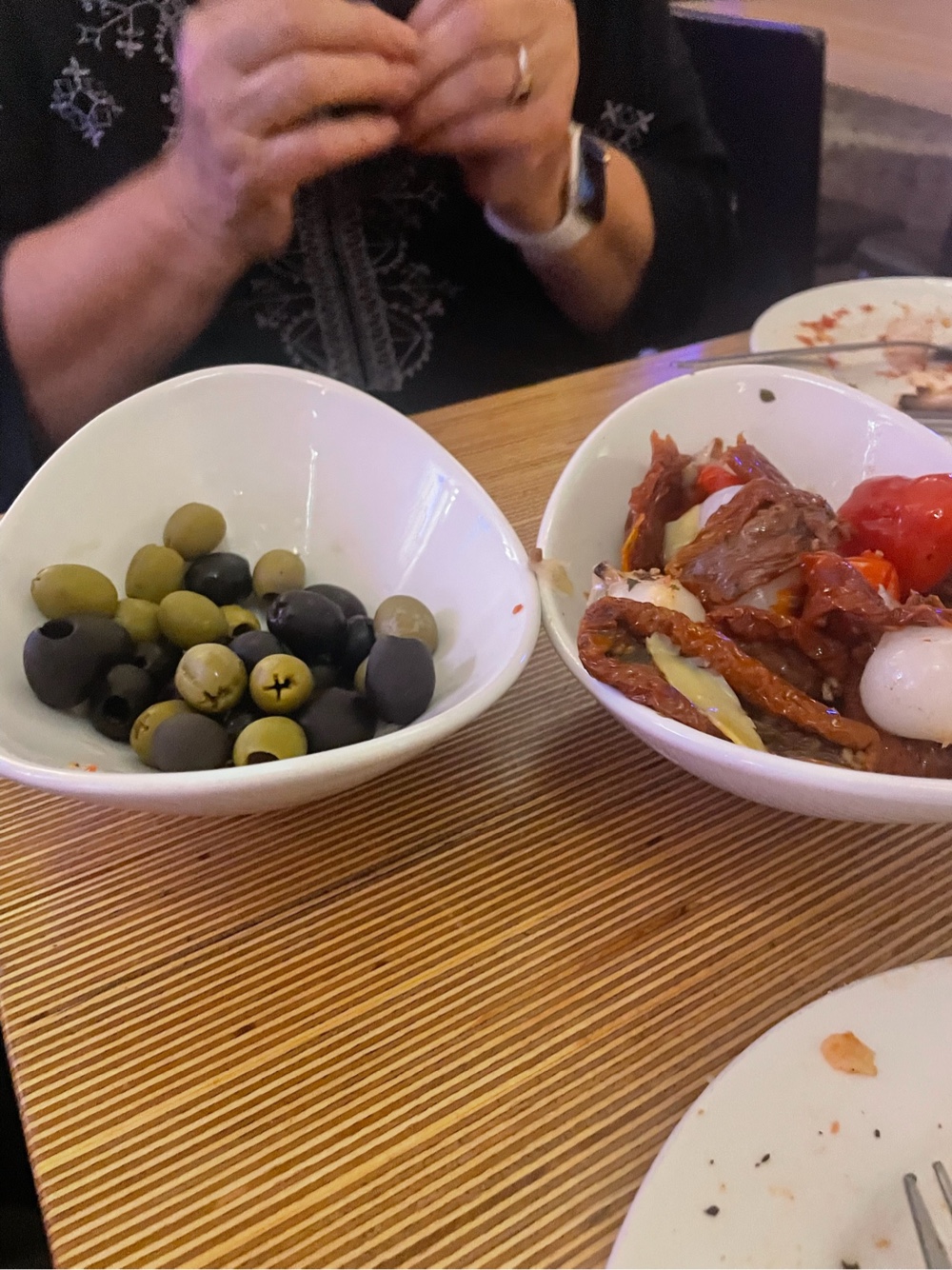 We had read that we could come early and order food. We ordered the three of the four items available on the menu: mixed olives, the antipasto and a pizza. The mixed olives looked like a can of green olives and a can of black olives dumped in a bowl. The antipasto was mostly sun-dried tomatoes with some pickles and onions.