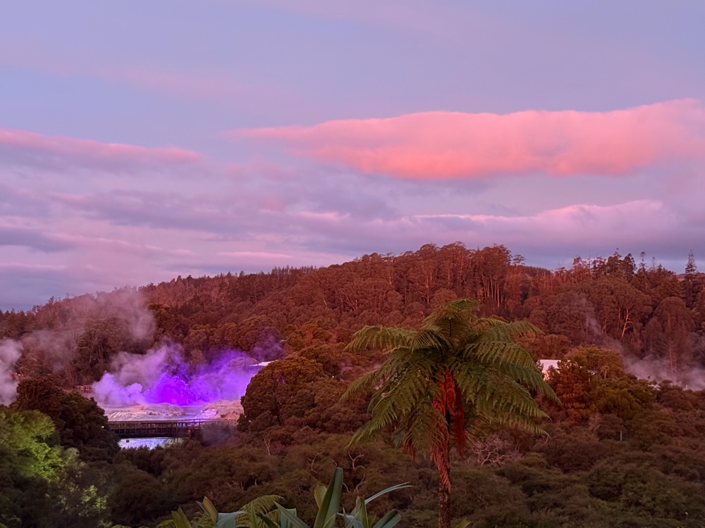 We were then loaded on a trolley and returned to the restaurant for a truly amazing buffet. I would like to share everything I ate but I don’t relish your condemnation so I will hit the highlights. I loved the Kanga porridge which I would suggest tasted like the creamed corn dish served at Thanksgiving. I didn’t take any of the hangi since I had enjoyed that at lunch. I tried the fry bread but I am not a fan. There were also many dishes I know weren’t traditionally Maori but they were excellent: chow mein, crème brûlée, chocolate covered crème puffs, etc. While we savored our dinner the sunset took over the sky. I rushed outside to get a couple photos. This is Pohutu Geyser.