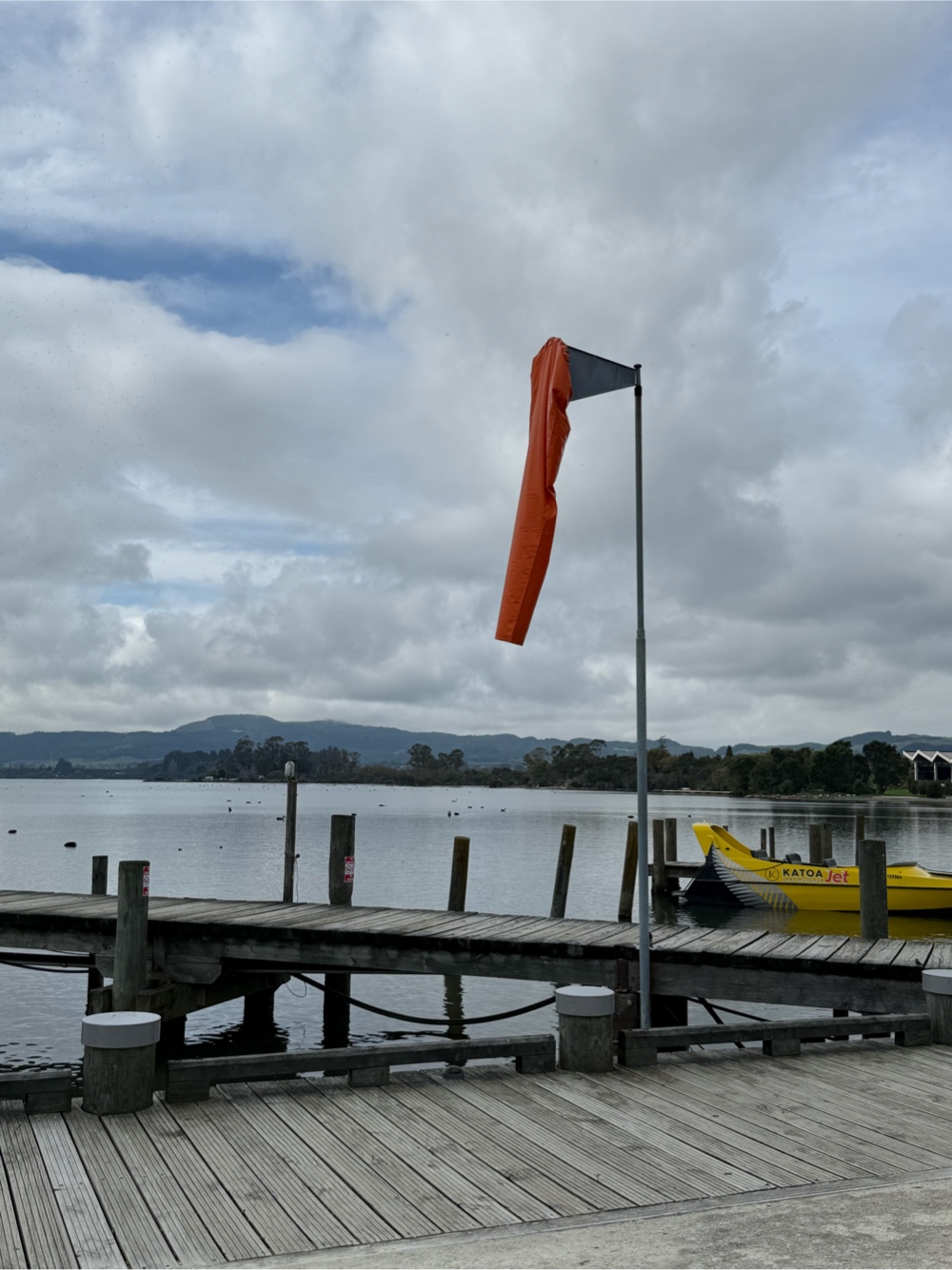 The wind sock next to the lake showed no current wind activity. I wonder what it will look like on Sunday when the expected cyclone blows through this part of New Zealand.