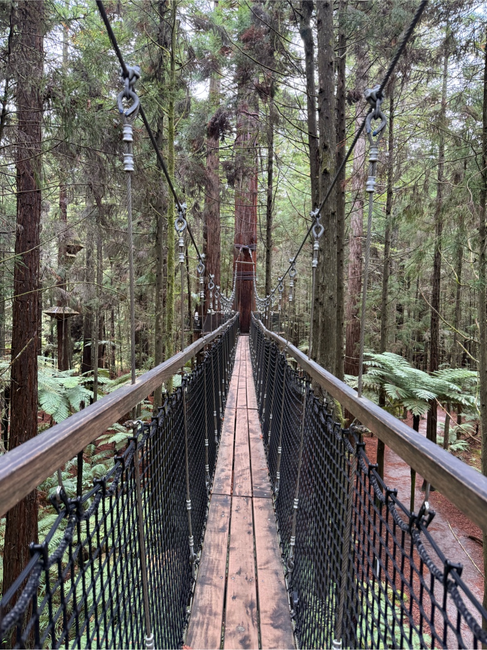 California Redwoods were introduced to this area in 1901. They grow faster here in Rotorua but because they do they are not a hardwood like we have in California. They are considered a soft wood here. Only eight people are allowed on a suspension bridge at a time. Only 20 people on the platforms in between the bridges.