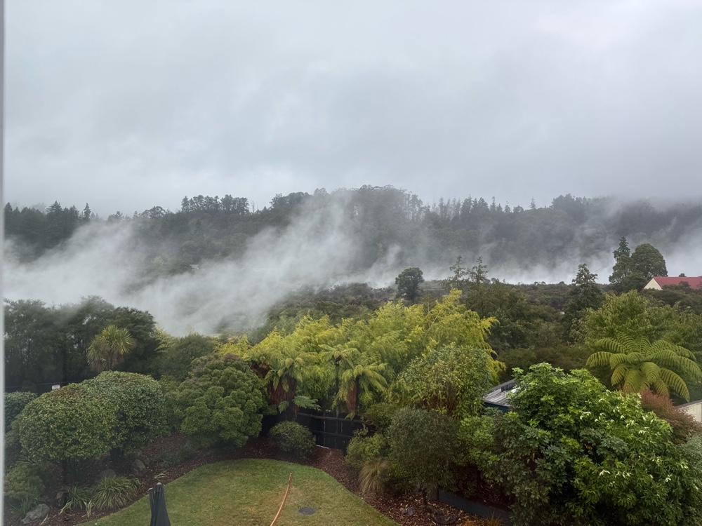 Our room is great, except that our bathroom floor is always wet. That is no exaggeration…..always very wet. The humidity is 91% in Rotorua today.