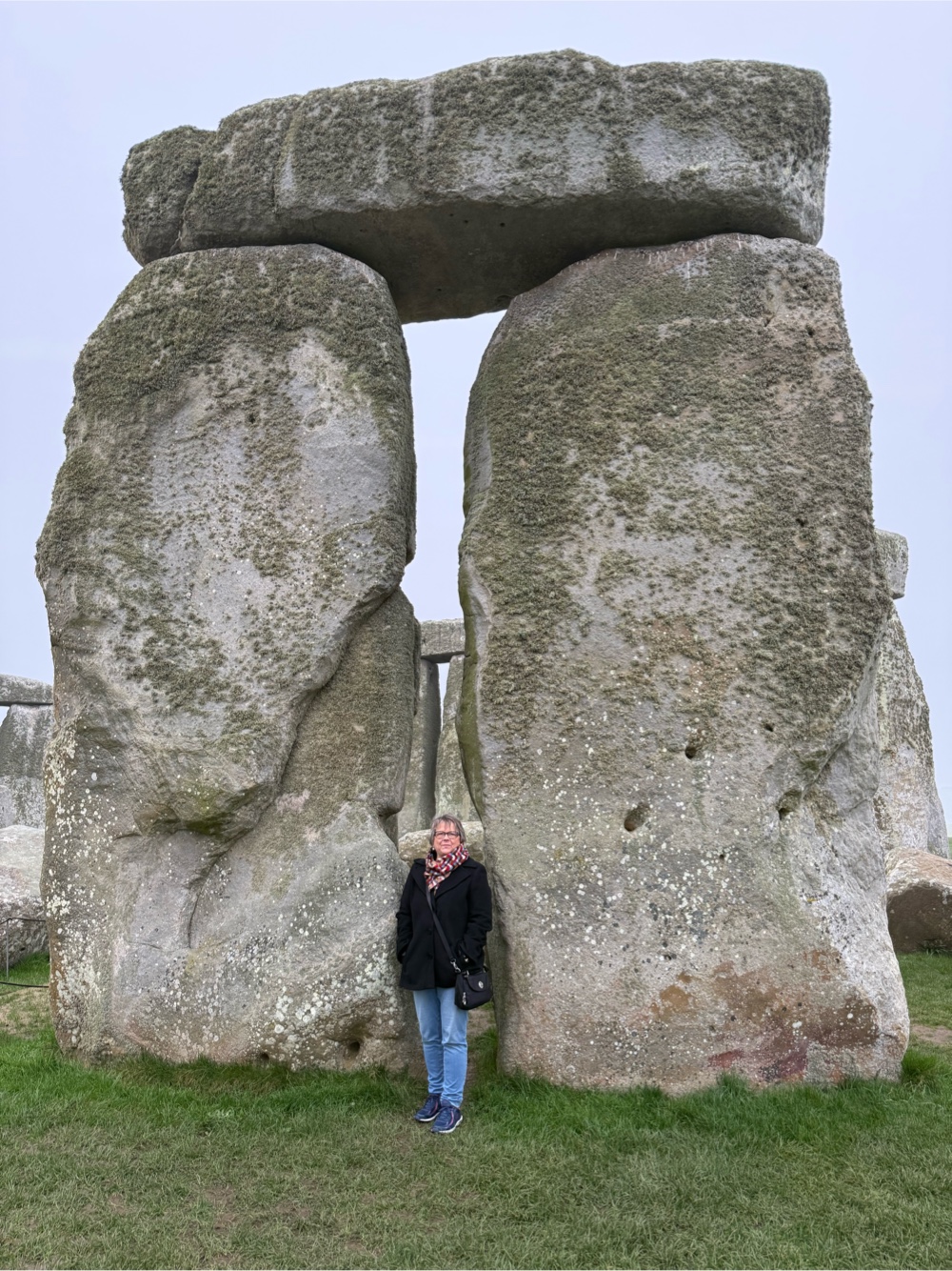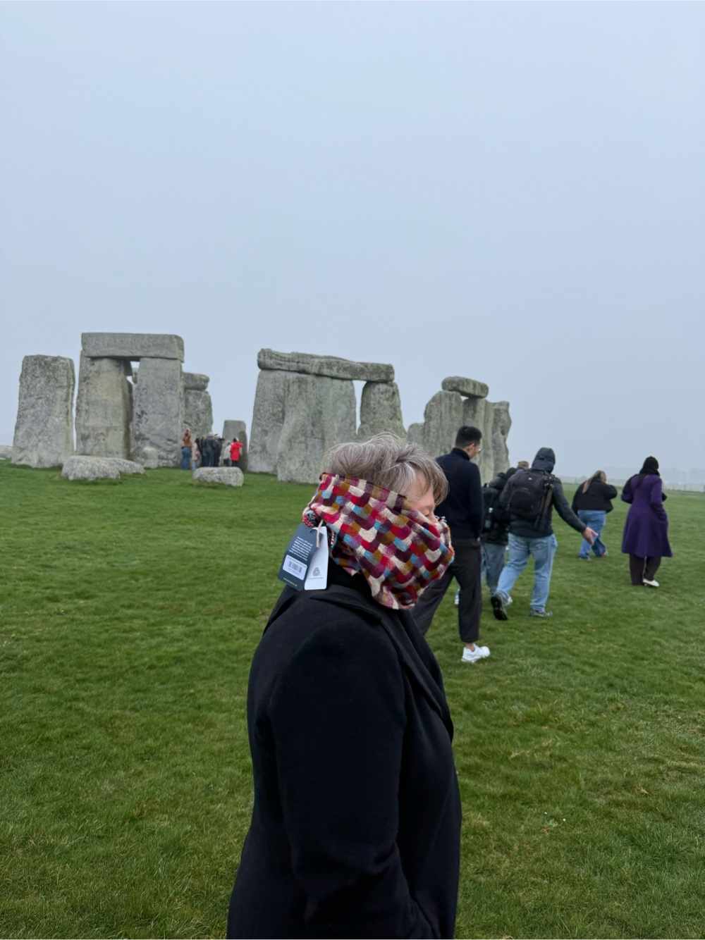 It was chilly and foggy when we were there, which Zozo assured us makes the experience even more captivating. Linda had purchased a scarf at the Visitor Center before we headed up to the stones. She needed a scissor to get the tag off but she didn’t have one of those lying around. The scarf worked just as well with the tags as without them.