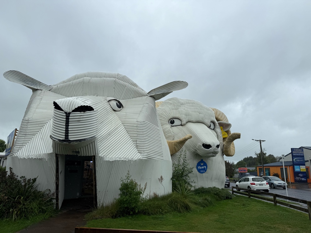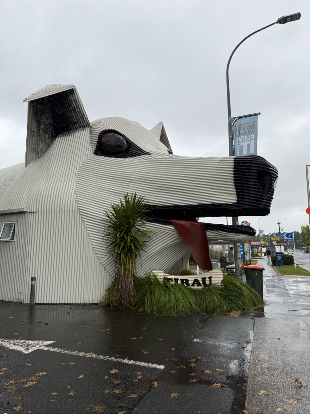 We spent three lovely hours in a van with Ameen, despite the heavy rain and our exhaustion. On the plane I watched a documentary about New Zealand’s former prime minister, Jacinda Aldern. I had been deeply moved by her leadership of kindness and empathy. Ameen was also a fan of Jacinda. We had a great conversation about politics, kiwi culture, tips on how to drive in New Zealand and what to be sure to see and do on this trip. He promised to text us some further recommendations. We made one potty stop on our 3 hour journey. My friend Jacki, who lives in Auckland, had recommended that we ask to stop at the public toilets in Tirau. The toilets are located inside this dog.