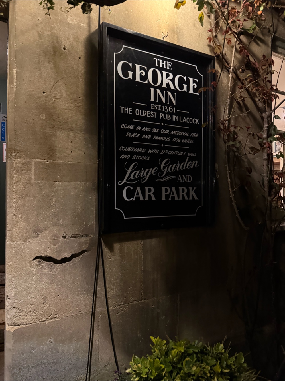 We returned to our bus with wet feet, cold hands and inspired hearts. We headed to Lacock, a medieval town. No one in Lacock owns their own home. The whole town is owned by the National Trust. People wait as long as three years to be allowed to rent a place and become one of the 200 residents of Lacock. Buses are not allowed in the town so we were dropped off at the edge of town and walked in the dark to the George Inn for dinner.