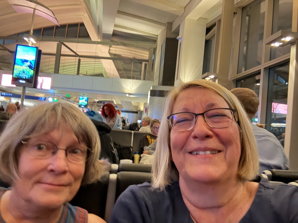 My friends drove us to Los Angeles airport in plenty of time to resolve our “glitches”. It seemed there was no security issue and we were handed out boarding passes without any fanfare. We whisked through TSA, even after Gayle’s TSA pre was not recognized. We had several hours to kill as we awaited our departure. Gayle and I practiced taking selfies as we waited. We suck at it!