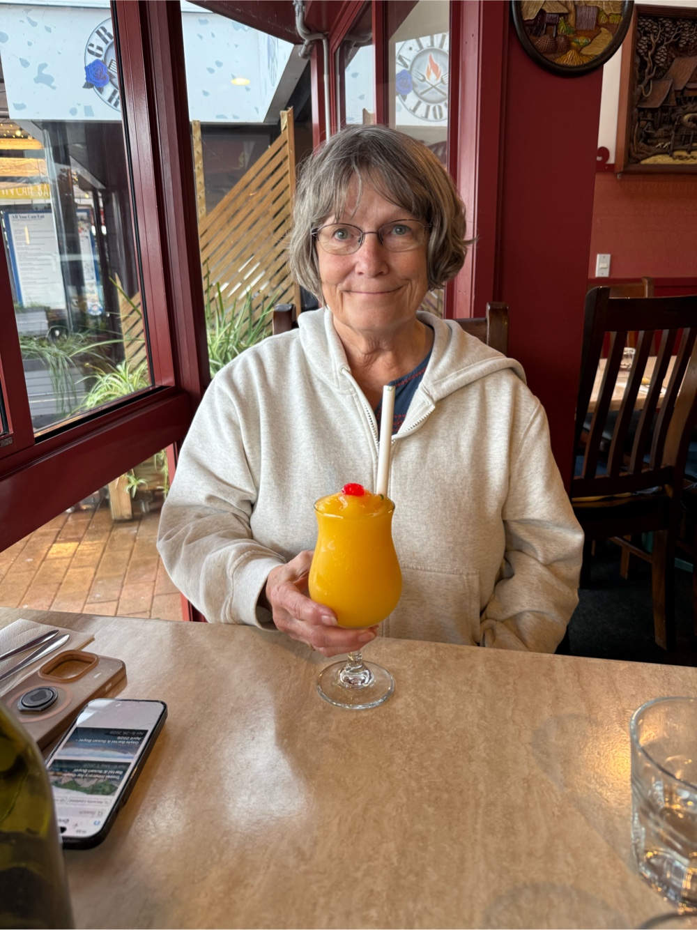 After landing at 6 a.m., navigating customs, driving to Rotorua and picking up our car, it was still only 10:45 a.m. We were hungry. We headed to a Thai restaurant that opened at 11 a.m. We shared pad Thai (Gayle’s first time to eat it). Gayle enjoyed her mango smoothie as we struggled to stay awake and be coherent.