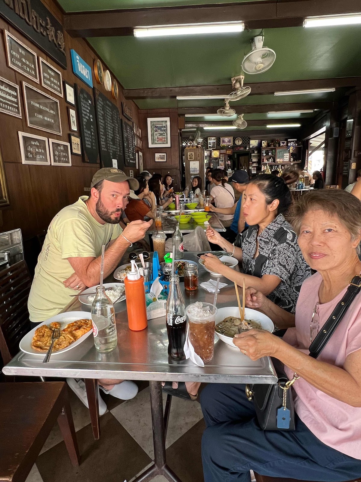 When everyone was up and caffeinated we headed out to explore Hua Hin. Our first stop was Jek Piek Restaurant. It is listed in Lonely Planet and described as a kind of food court setup. We walked in at 11:30 a.m. and were ushered to a table by a woman who was definitely large and in charge. She brought us the extensive menu and told us that there was only food available from three of the pages. They opened at 6 a.m. for breakfast and close at 12:30 p.m. The vendors are in food carts around the perimeter of the restaurant and all but two of them had left.