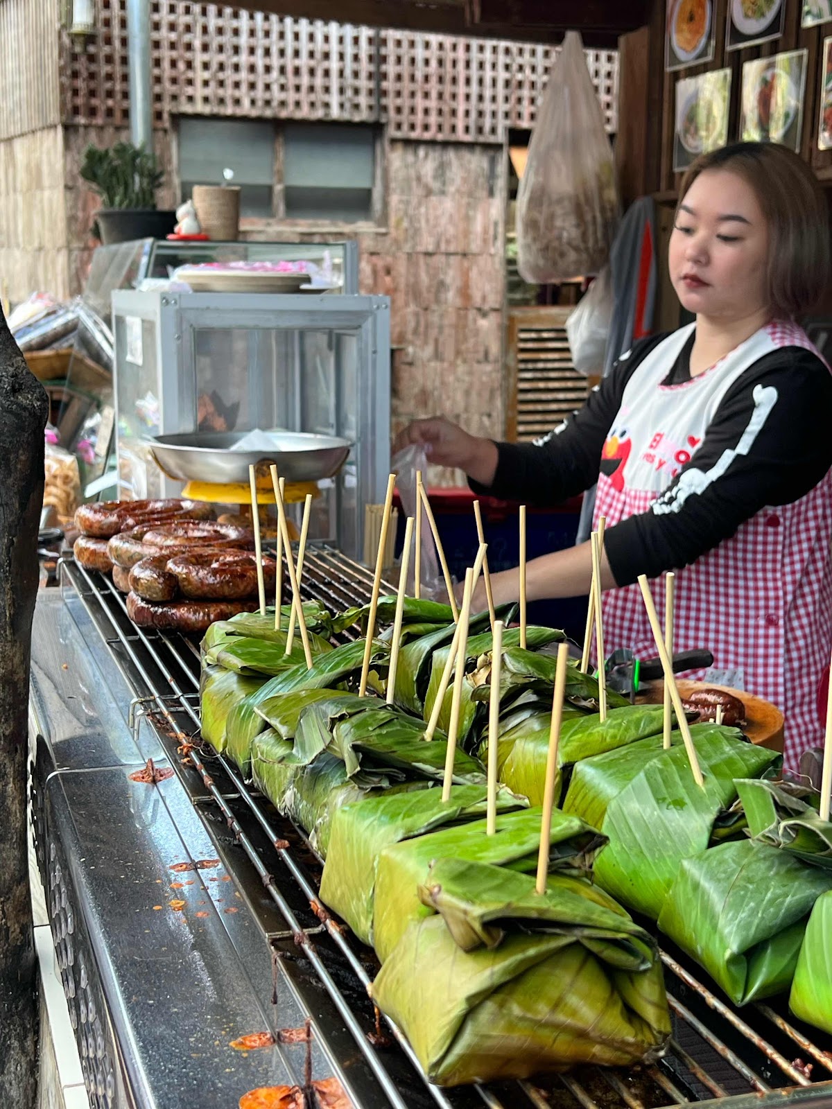 Most of our experience of Mae Kampong revolved around food. We walked up the narrow road through the center of the village, stopping to taste their sausages on a stick, eggs cooked in a banana leaf, fermented pork in a banana leaf, croissants marked with a fish and filled with everything from sweet potatoes to truffles, more sausage, grilled pork, and my all time favorite — a fresh strawberry on mochi with red bean, taro, purple yam or matcha. I can’t possibly describe how delicious it was.