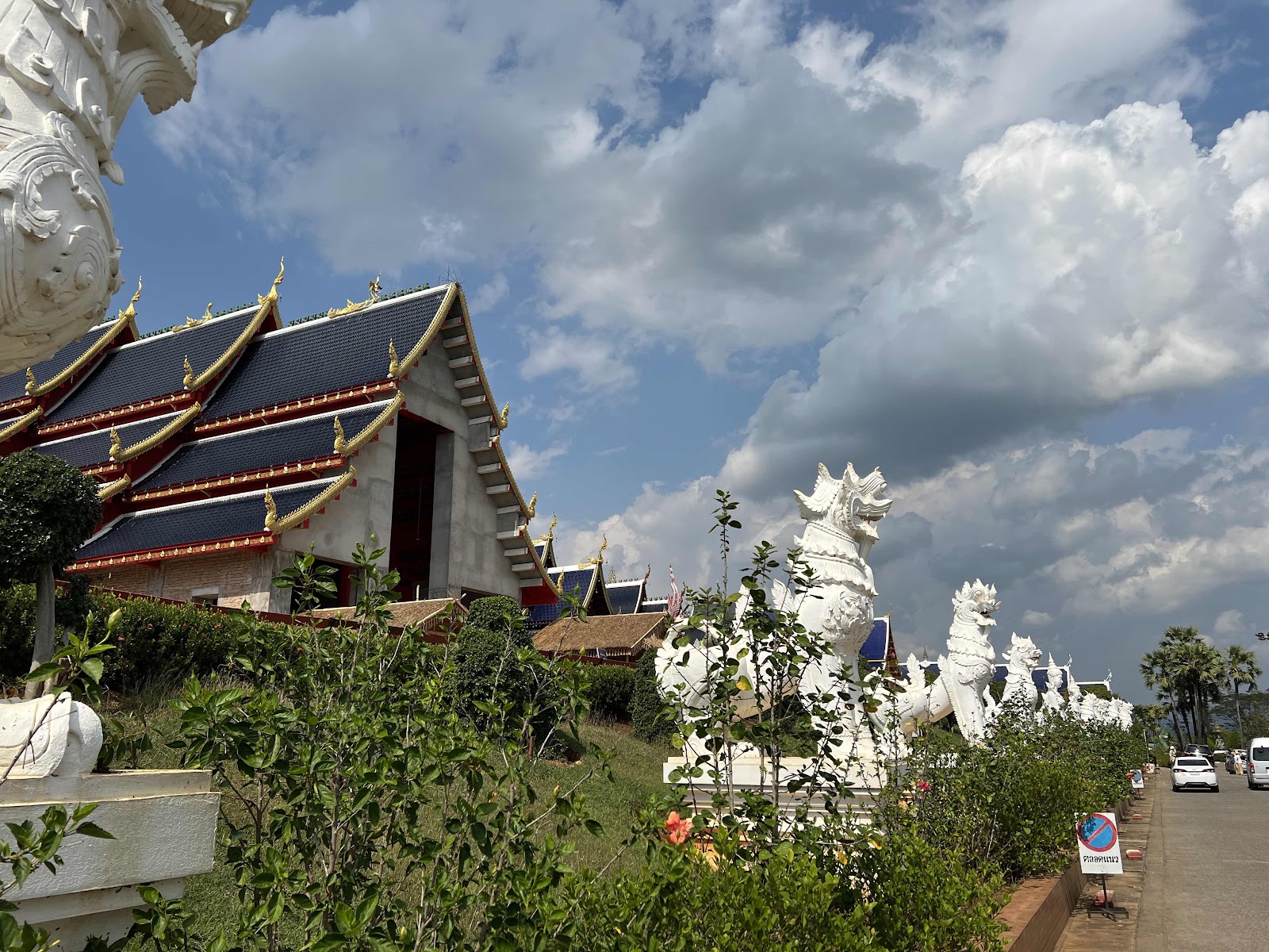 Wat Ban Den sits on a small hill, with a lush landscape surrounding it. A series of white lions greet you as you arrive.
