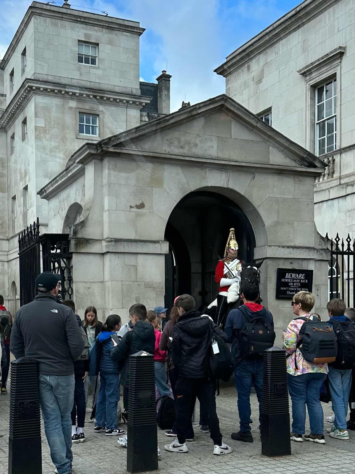 We walked down past the armed guards in front of Clarence House where Charles and Camilla live. Then we went to St. James’ Palace to watch the guards there.