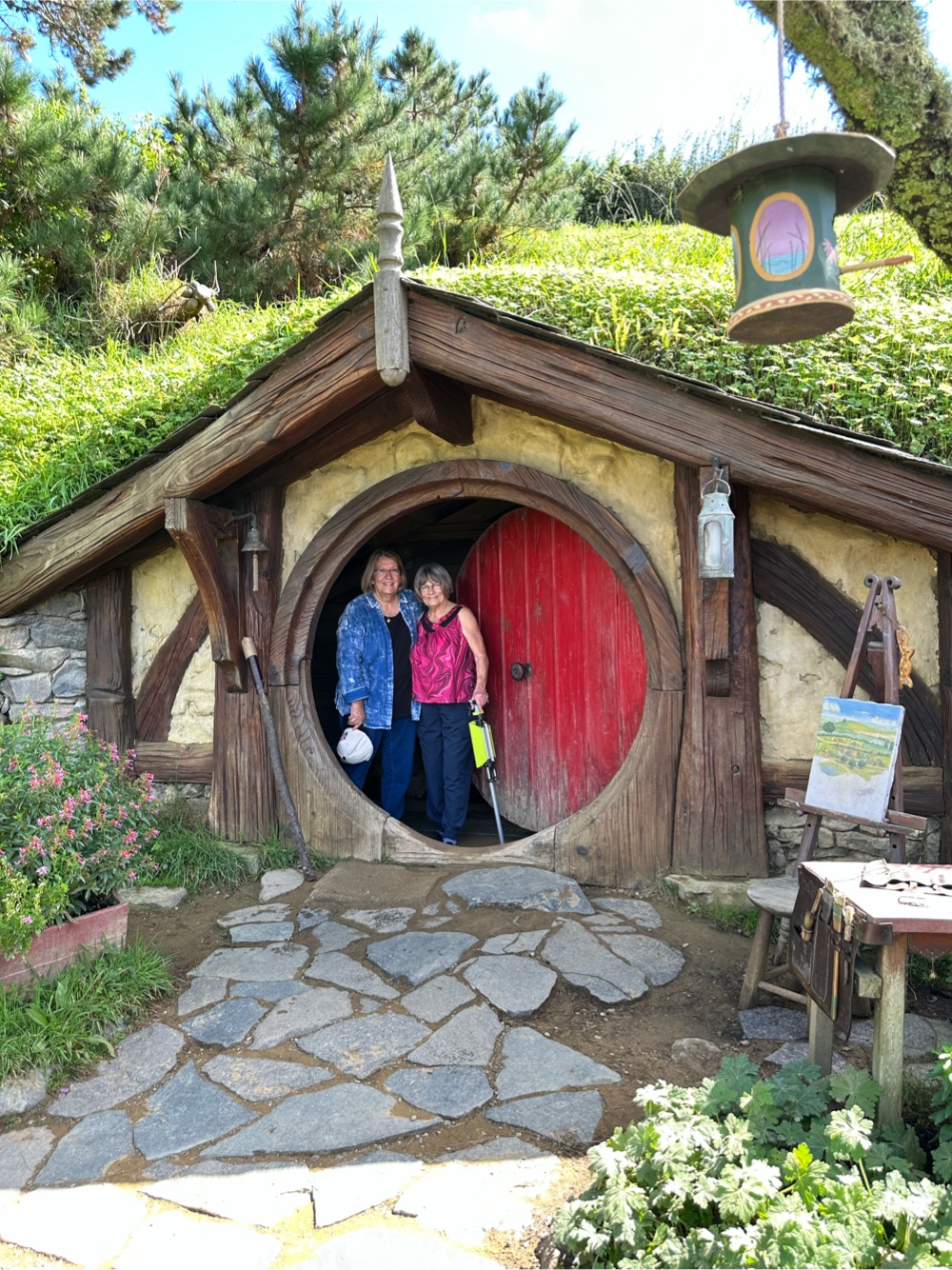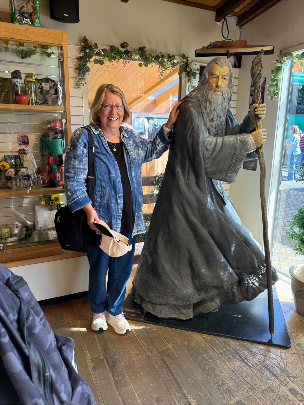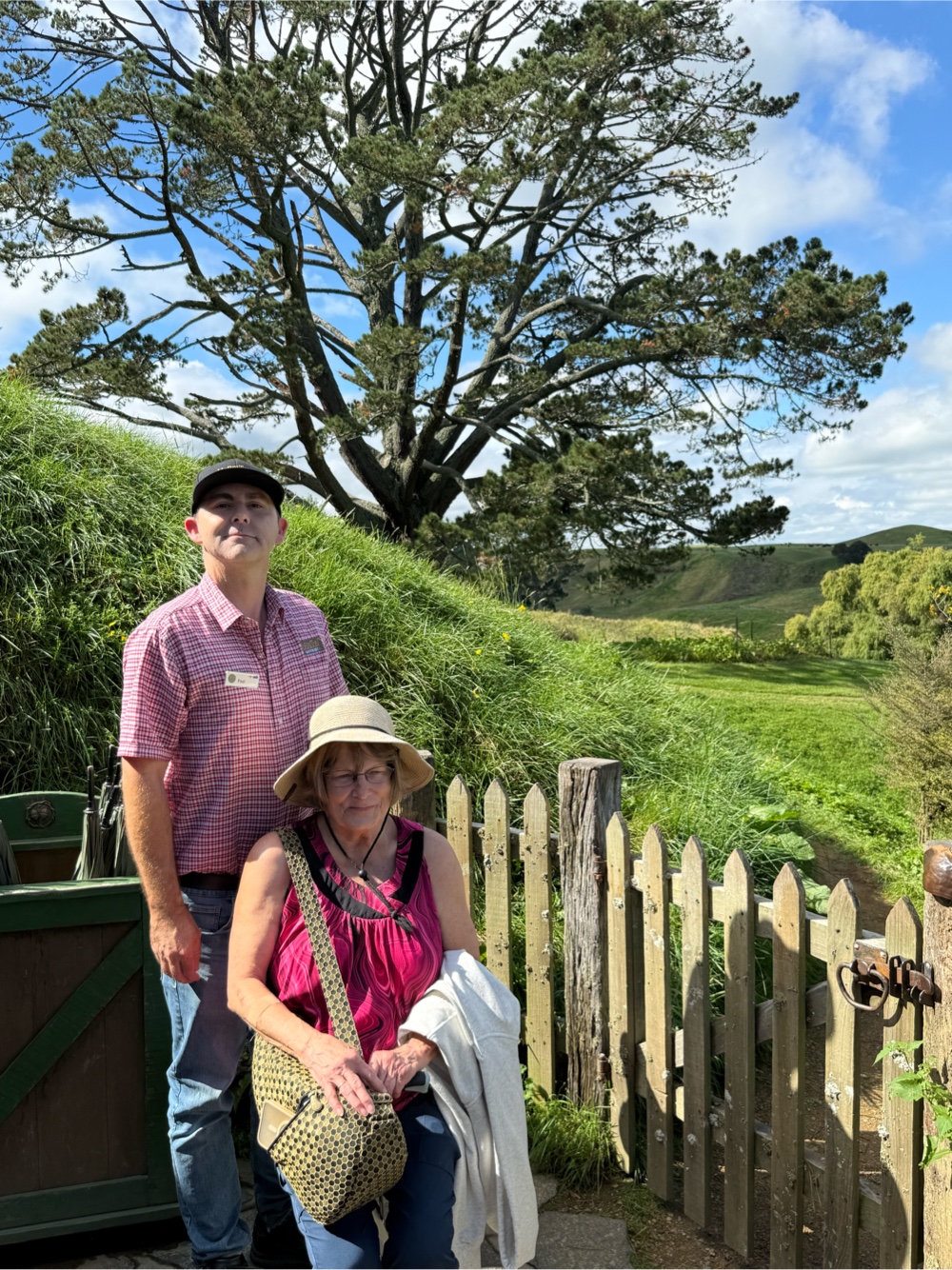 We had a tour of Hobbiton scheduled for 11:40 a.m. It is about an hour drive from Rotorua. We had a golf cart tour arranged because the 90 minute tour by foot would not be possible for Gayle. She travels with a cane equipped to turn into a seat but the path through Hobbiton is long and steep. We arrived early and were directed to be seated on a designated bench to wait for our tour. I slipped into the gift shop to get my picture with Gandalf and to see if there was anything worth buying for the Lord of the Ring fan in my family. I succeeded at the first task but I was not impressed with their merch.